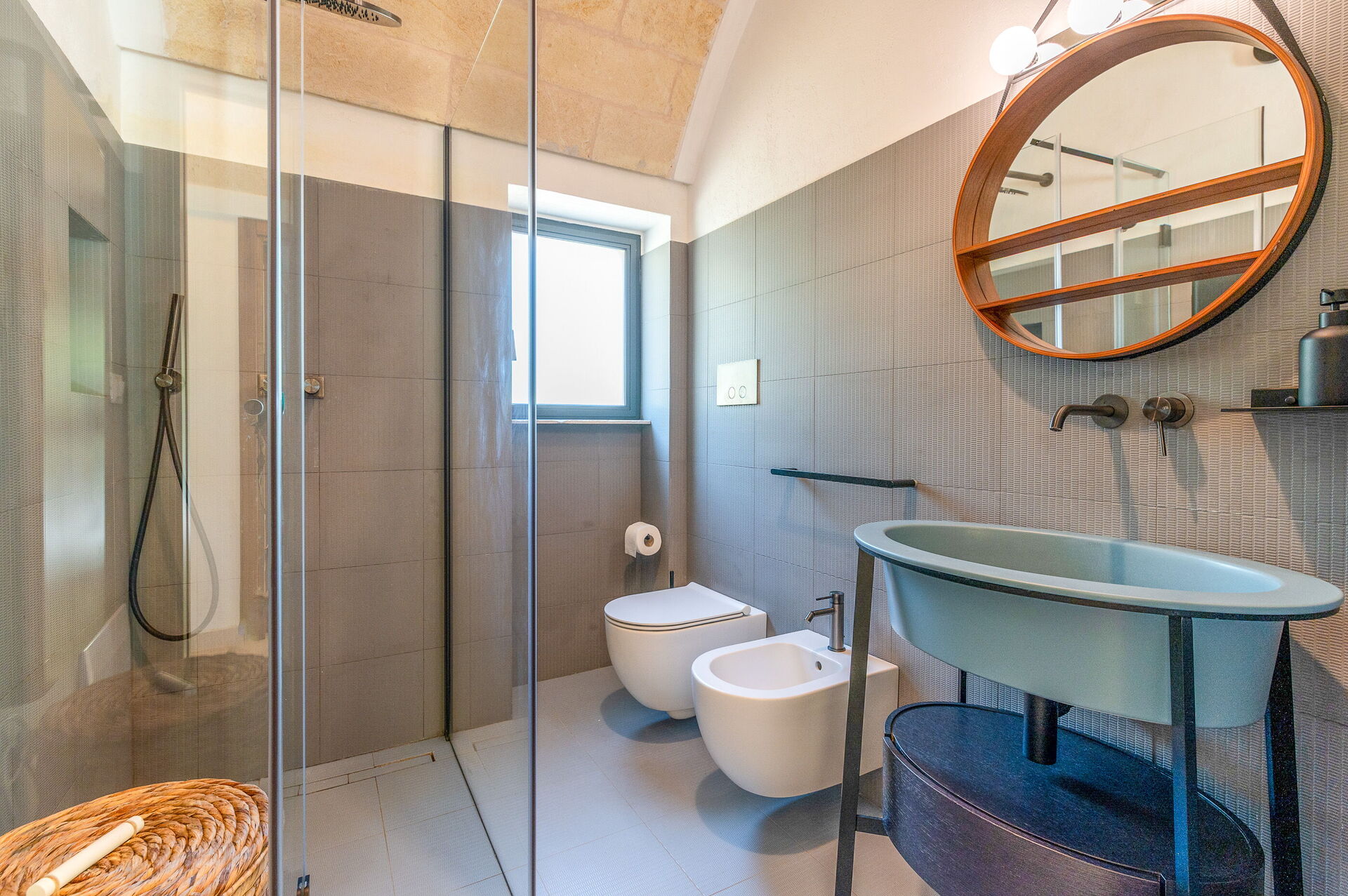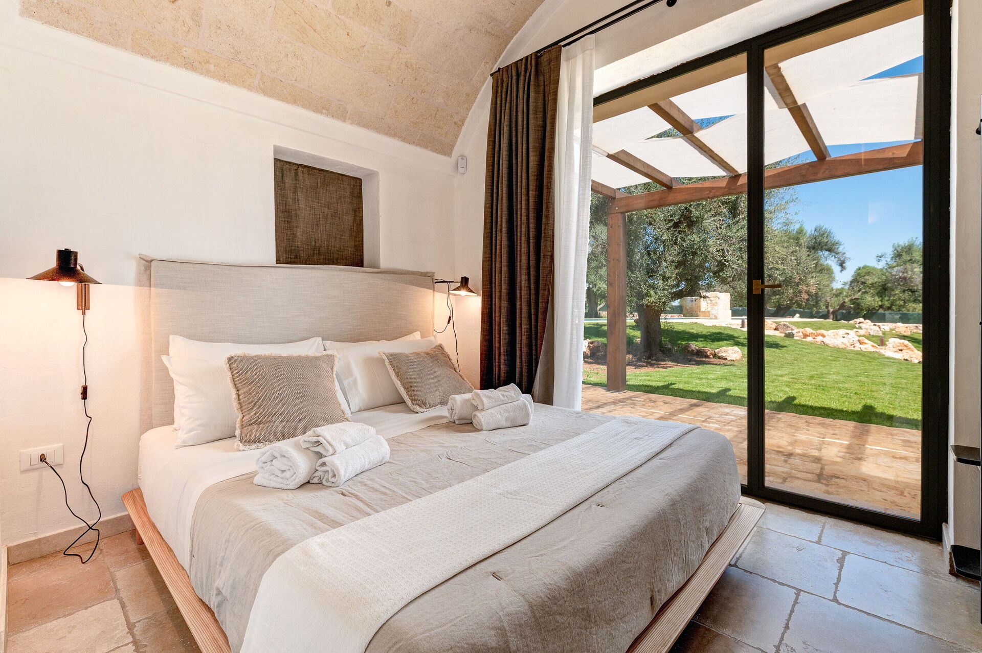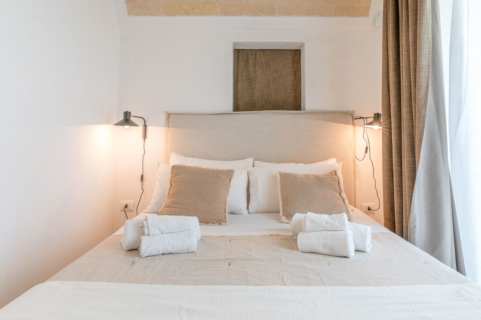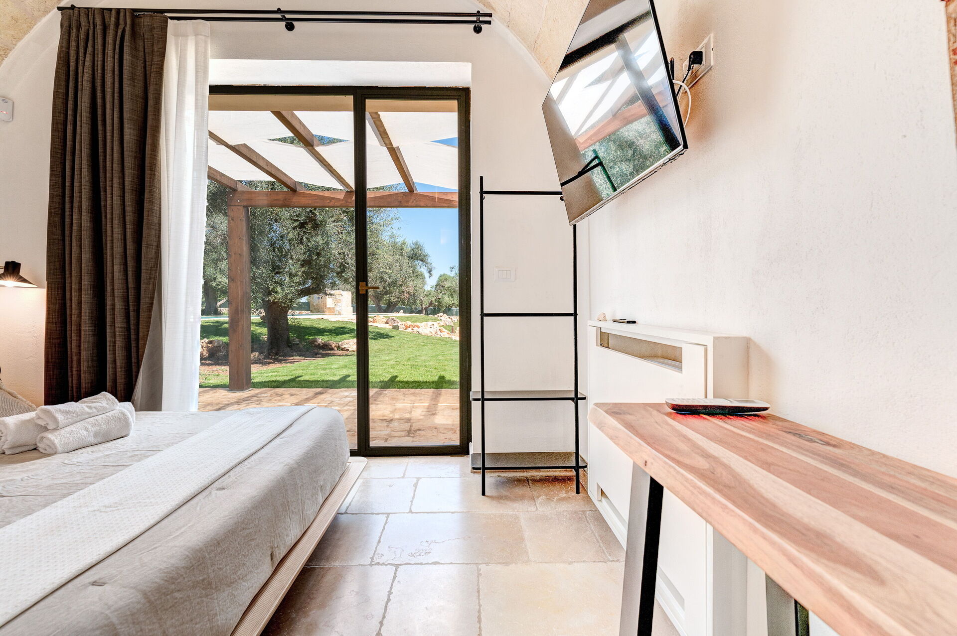 The Suite Ceglie consists of an entrance hall with one bedroom (queen size bed) with a small desk and ensuite bathroom. It is fully equipped with a Nespresso Vertuo machine, tea kettle and a 43” smart TV. The suite can be connected if needed to the Suite Ostuni.
