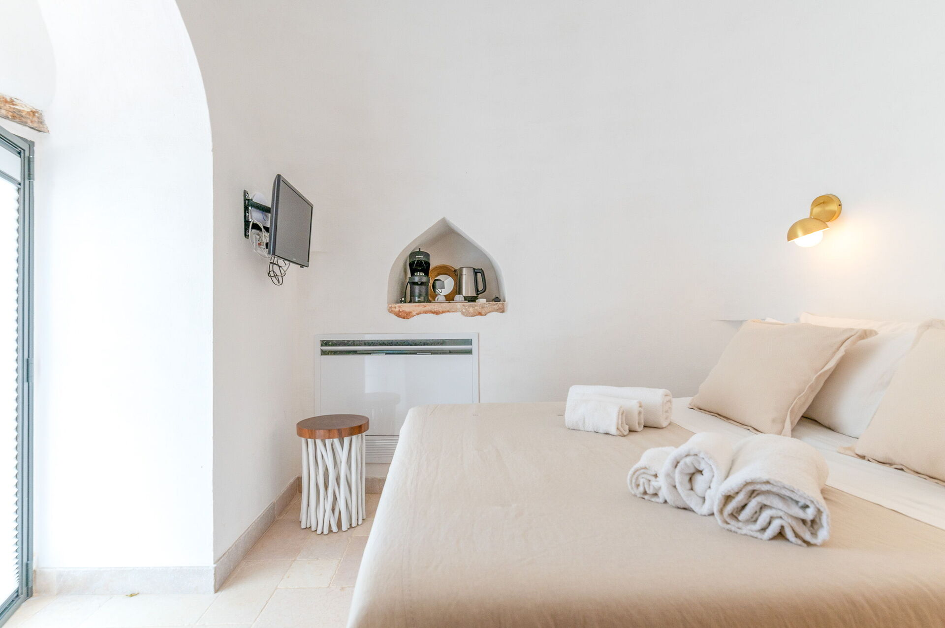 The Trullo Suite with consists of a single room with a french size bed and ensuite bathroom. It is fully equipped with a Nespresso Vertuo machine, tea kettle and a 24” smart TV.